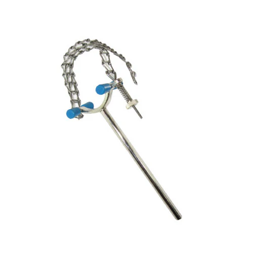 Instrumento de sujeción, utilizada para sujetar vasos de precipitados si estos se encuentran calientes, su cadena ajustable permite la toma de vasos de diferentes capacidades.
